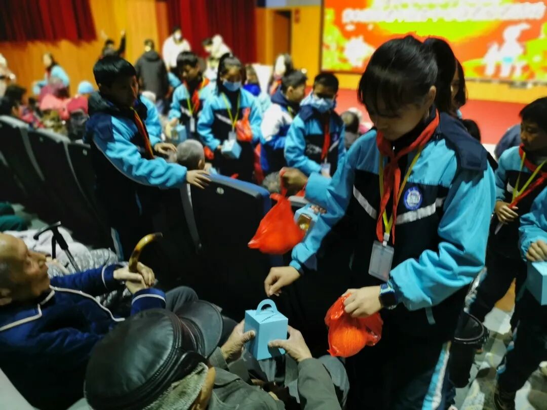 节目表演结束后,孩子们亲自将礼品送给老人们,因为今天也是毛爷爷诞辰128周年之际,孩子们也准备了蛋糕同时致敬了伟人!