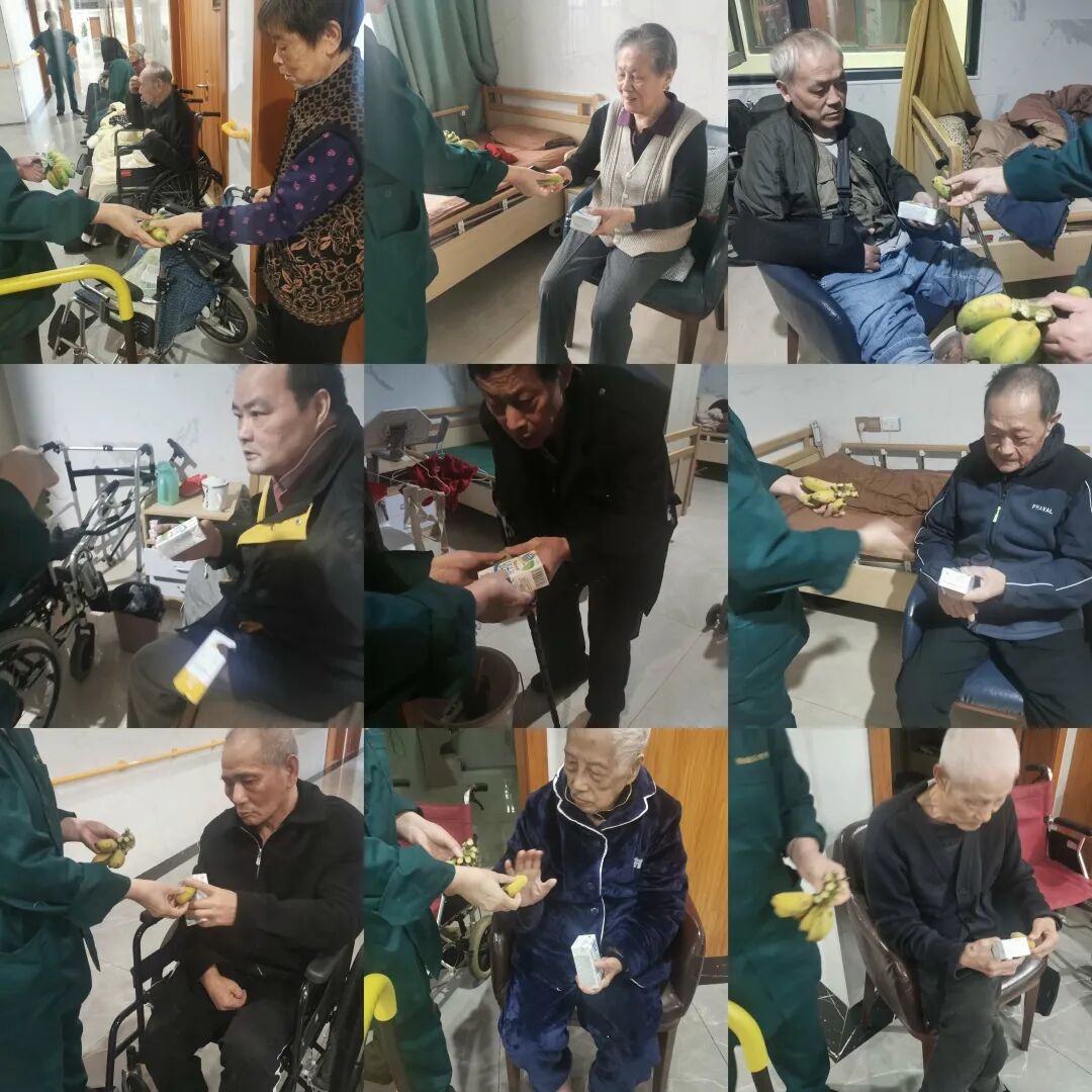 中心工作人员给老人们派发孩子们带过来的慰问品